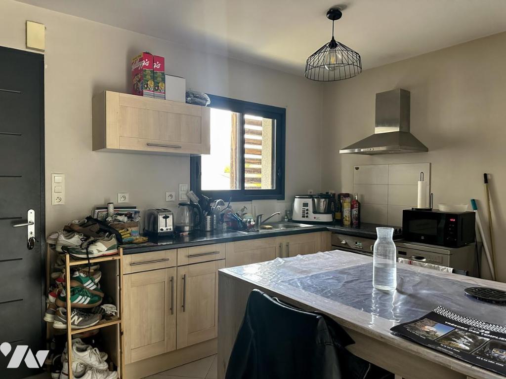 Au rez-de-chaussée : Pièce de vie traversante avec cuisine ouverte équipée et donnant sur jardin, WC séparés avec lave mains.