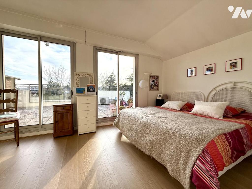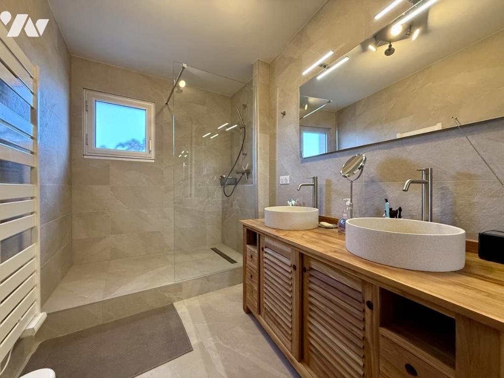 A l’étage : pièce palière en mezzanine avec coin bureau, 3 chambres (13,57 m², 13,09 m² et 9,76 m²), salle de bains, WC, terrasse d’environ 57 m² exposée Sud (communicante avec la terrasse du niveau principal via un escalier extérieur).