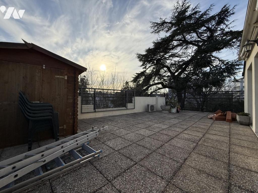 Garage double et cave attenante en sous-sol, cabanon sur la terrasse de l'étage.